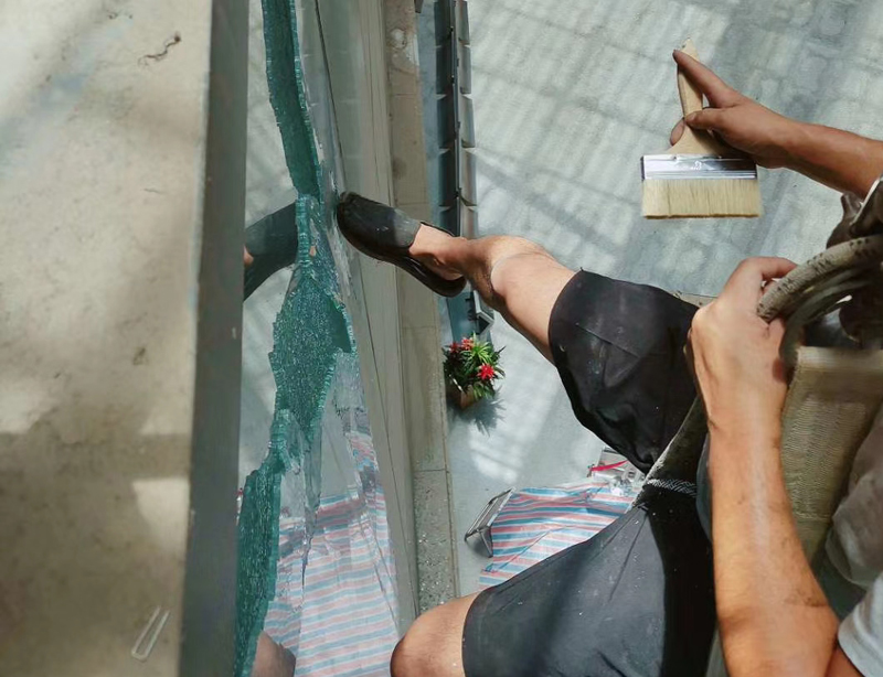 第三步:玻璃運到施工現(xiàn)場后,工人現(xiàn)場乘坐吊籃現(xiàn)場安裝施工。最后施工完成。